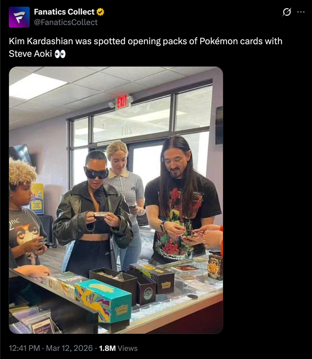 Kim Kardashian and Steve Aoki were spotted at Aokiâs card shop opening PokĂŠmon packs, and the photo is now making the rounds online as card collectors joke about a possible top signal for the market.